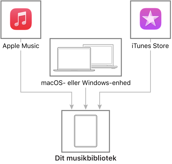 Hør musik, der er gemt på iPad, samt musik streamet via internettet. Du kan opbygge et musikbibliotek, som er din samling af sange og album, på mange måder.