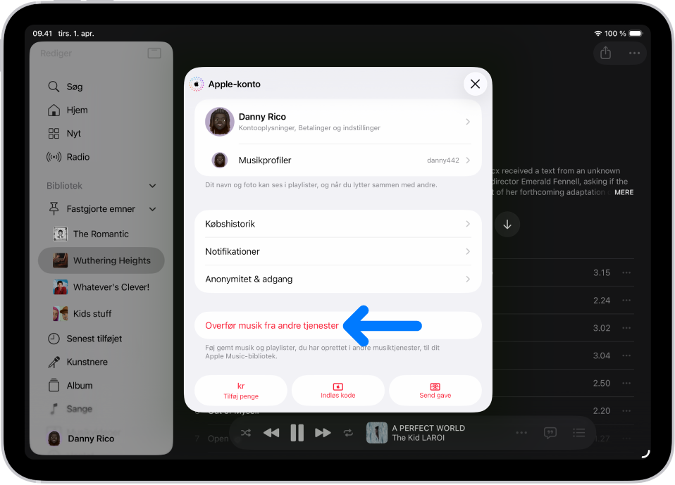 Med et abonnement kan du nemt overføre din musik fra andre musiktjenester til Apple Music. Tryk på dit profilsymbol i nederste venstre hjørne i indholdsoversigten, og tryk på Overfør musik fra andre tjenester. Følg instruktionerne på skærmen for at overføre dit eksisterende bibliotek eller dine eksisterende playlister.