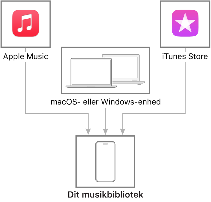Hør musik, der er gemt på iPhone, samt musik streamet via internettet. Du kan opbygge et musikbibliotek, som er din samling af sange og album, på mange måder.