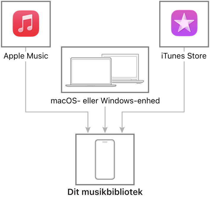 Hør musik, der er gemt på iPhone, samt musik streamet via internettet. Du kan opbygge et musikbibliotek, som er din samling af sange og album, på mange måder.