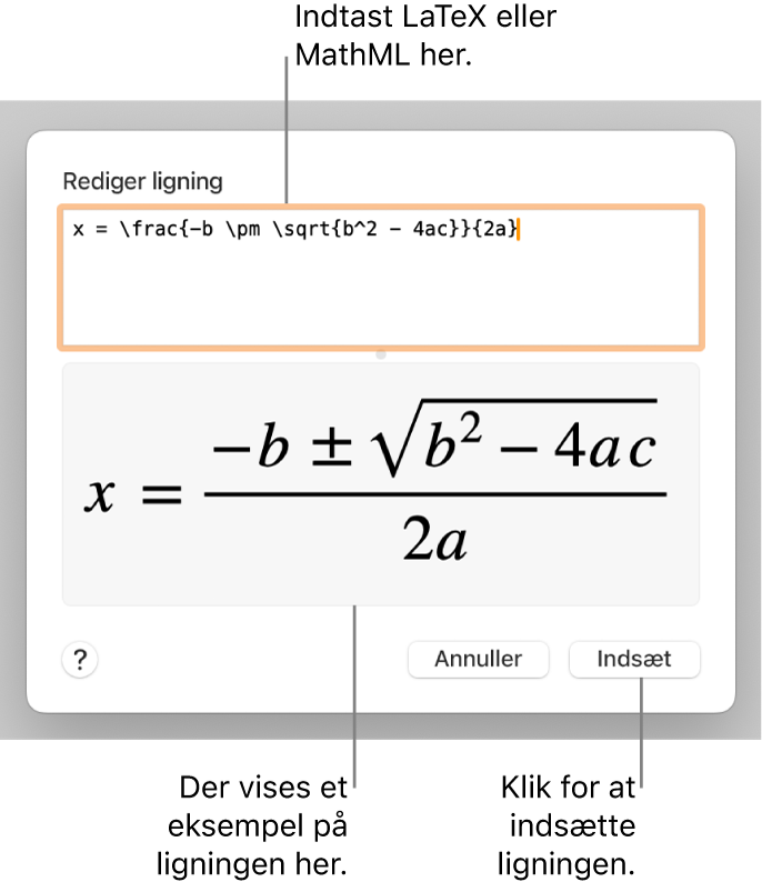 Du kan inkludere matematiske udtryk og ligninger i dokumenter. Når du vil tilføje en ligning, opretter du den i ligningsdialogen i Pages ved hjælp af LaTeX-kommandoer eller MathML-elementer og indsætter den derefter i dokumentet.