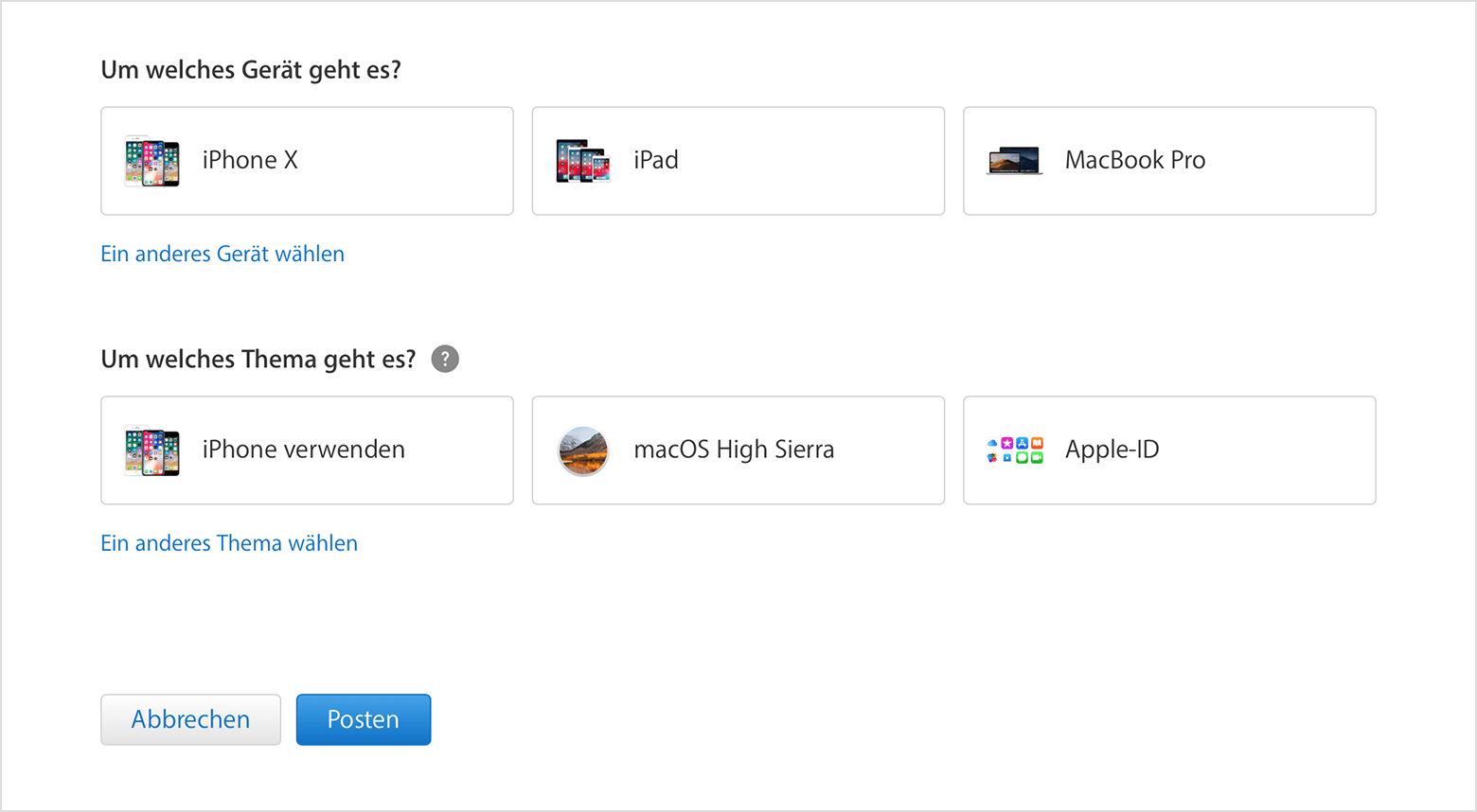 - Wähle dann das Gerät, auf das sich deine Frage bezieht, und wähle ein Thema.