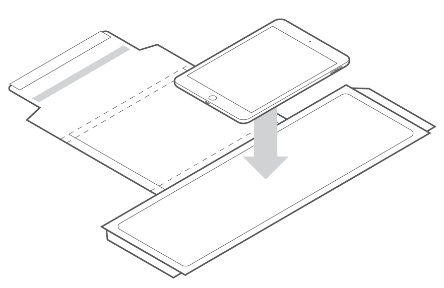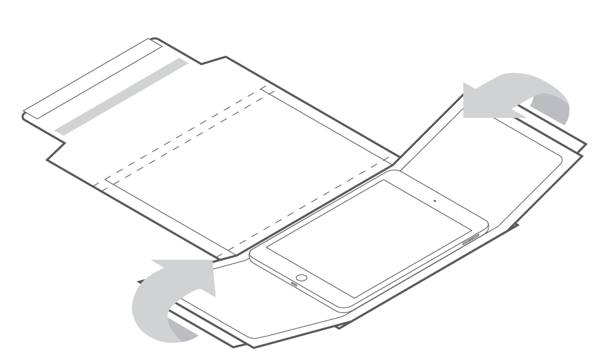 - Entfalte den Versandkarton und die gepolsterten Klappen an beiden Enden des Versandkartons. Lege dein iPad zwischen die gepolsterten Klappen.
