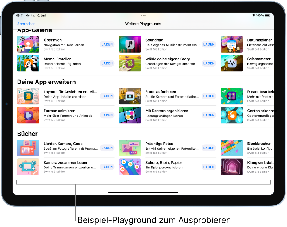 auf dem iPad unten im Abschnitt „Bücher“ des Bildschirms „Weitere Playgrounds“ auf einen Playground, um eine Beschreibung anzuzeigen.Tippe beim Arbeiten in einem Playground-Buch oder App-Playground links oben auf