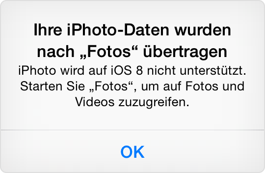 Um Ihre Daten von iPhoto für iOS in die App "Fotos" zu migrieren, tippen Sie auf die App "iPhoto". Dabei wird der Dialog "Daten von iPhoto in Fotos migrieren" angezeigt.