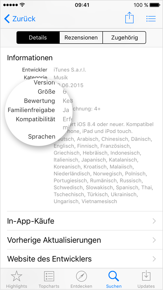 - Suchen Sie die App, die Sie freigeben möchten. Suchen Sie in der Seitenleiste auf der rechten Seite unter "Informationen" nach "Familienfreigabe".