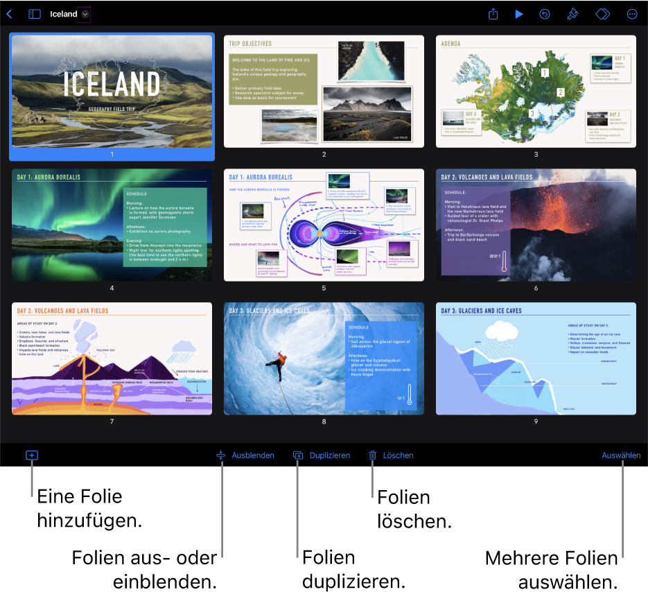 Folien schnell hinzufügen, aus- und einblenden, duplizieren oder löschen: Wähle eine oder mehrere Folien aus und tippe unten auf dem Bildschirm auf die entsprechende Taste.