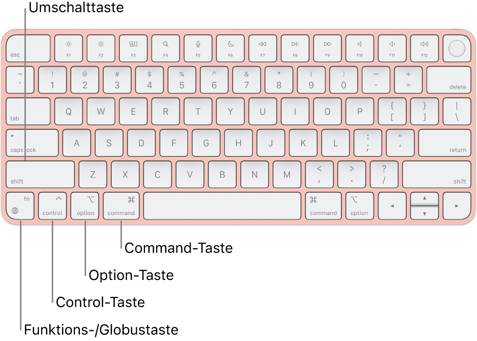 Hinweis: Wenn du ein Magic Keyboard mit Touch ID und Ziffernblock von Apple hast, befindet sich die Taste „Fn/Globus“ rechts neben der Löschtaste (Rückschrittaste).