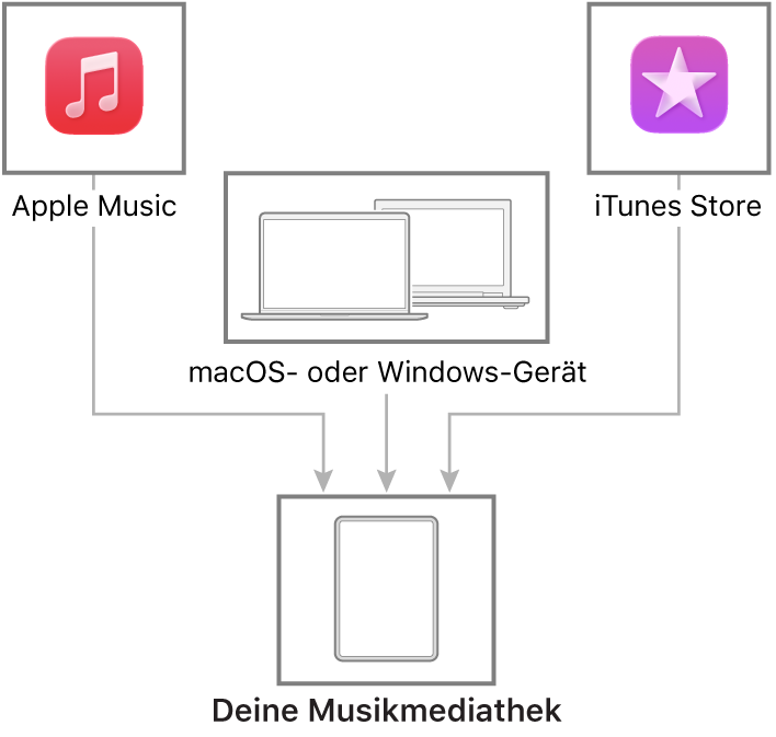 Stelle eine Verbindung zu deinem Mac- oder Windows-Gerät her, um Musik von deinem iPad auf ein anderes Gerät zu übertragen und sie zu aktualisieren. Um unterstützte Inhalte zu synchronisieren, verwende „Musik“ (macOS 10.15 oder neuer) oder iTunes (macOS 10.14 oder neuer und ein Windows-Gerät).