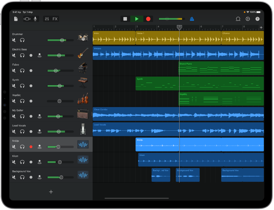 Επιλέξτε ανάμεσα σε εκατοντάδες Apple Loop για προσθήκη στο τραγούδι σας, προσθέστε έναν ντράμερ που θα παίζει συνοδεύοντας τη μουσική που έχετε εγγράψει και προσθέστε εναλλαγές στο τραγούδι σας με προσθήκες εφέ.