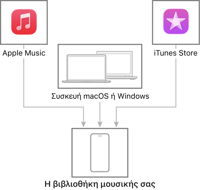 Συνδέστε το Mac ή τη συσκευή Windows για μεταφορά και ενημέρωση μουσικής μεταξύ του iPhone και της συσκευής σας. Για συγχρονισμό υποστηριζόμενου περιεχομένου, χρησιμοποιήστε τη Μουσική (macOS 10.15 ή μεταγενέστερη έκδοση) ή το iTunes (macOS 10.14 ή προγενέστερη έκδοση και συσκευές Windows).
