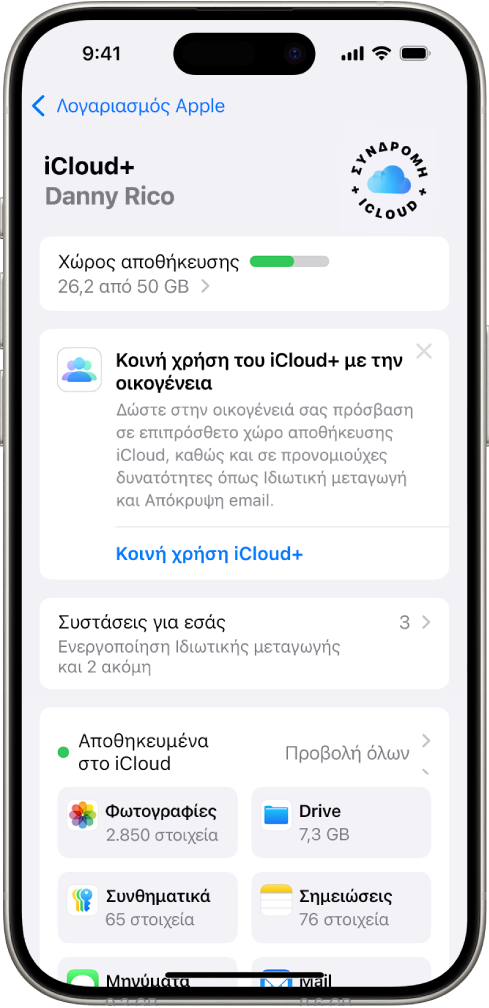 Το iCloud αποθηκεύει με ασφαλή τρόπο τις φωτογραφίες σας, τα βίντεο, τα έγγραφα, τα εφεδρικά αντίγραφα και πολλά ακόμη, και τα διατηρεί ενημερωμένα σε όλες τις συσκευές σας, αυτόματα. Με το iCloud, μπορείτε επίσης να μοιράζεστε φωτογραφίες, ημερολόγια, σημειώσεις, φακέλους και αρχεία με τους φίλους και τους συγγενείς σας. Το iCloud σάς παρέχει έναν λογαριασμό email και 5 GB δωρεάν χώρου αποθήκευσης για τα δεδομένα σας. Για περισσότερο χώρο αποθήκευσης και πρόσθετες δυνατότητες, μπορείτε να εγγραφείτε συνδρομητές στο iCloud+.