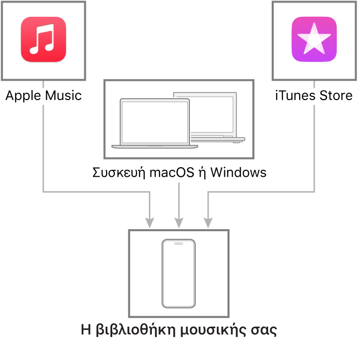 Απολαύστε μουσική που είναι αποθηκευμένη στο iPhone, καθώς και μουσική που αναπαράγεται σε ροή μέσω του Διαδικτύου. Μπορείτε να δομήσετε μια βιβλιοθήκη μουσικής –τη συλλογή τραγουδιών και άλμπουμ σας– με πολλούς τρόπους.