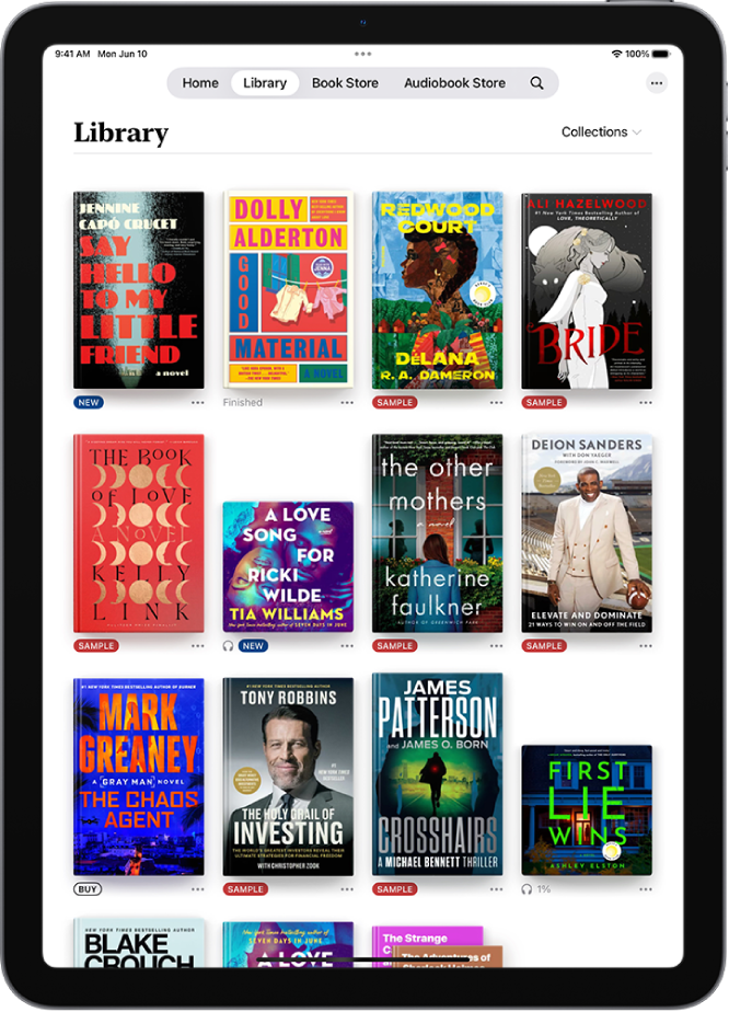 The books and audiobooks you purchase in the Books app are saved in your library and automatically sorted into collections, such as Audiobooks, Want to Read, and Finished.