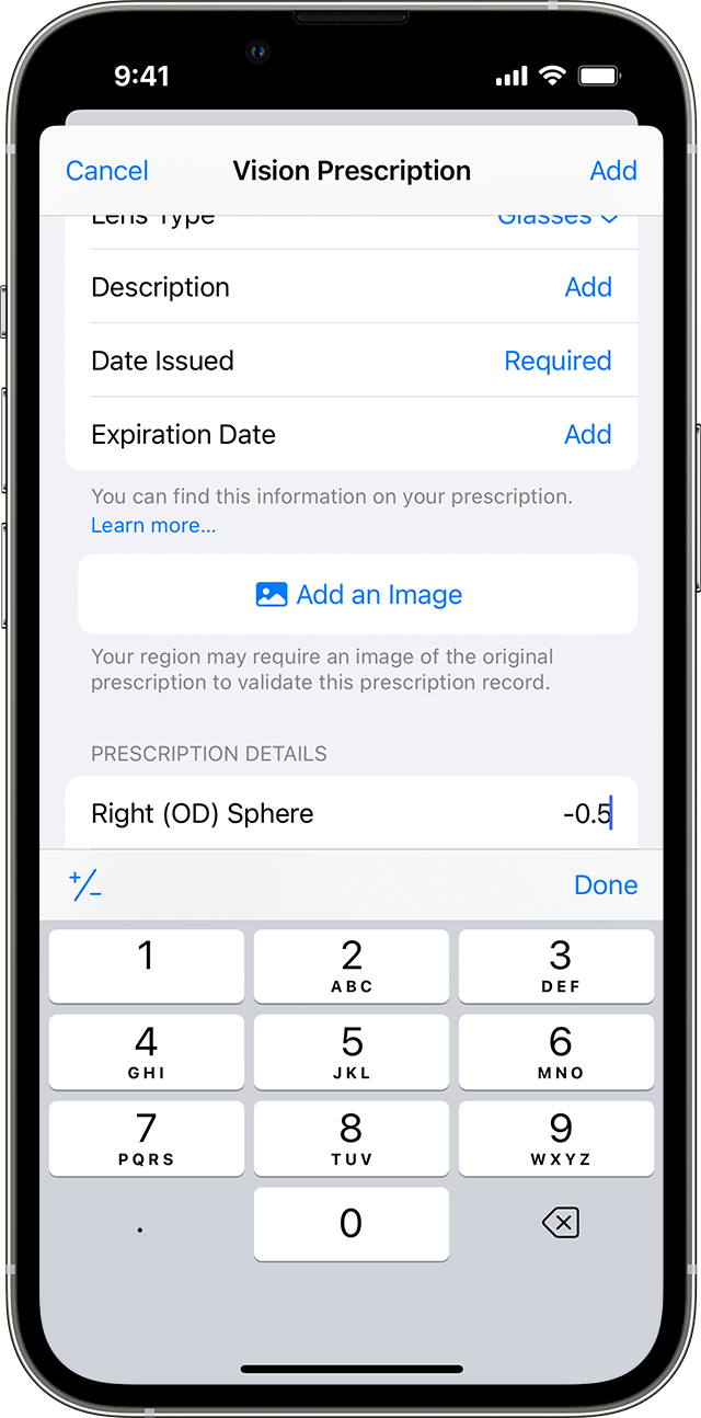 If you have an image or PDF of your prescription saved on your iPhone, you can upload it to the Health app. If you don't have a saved copy, you can also manually add your vision prescription information.