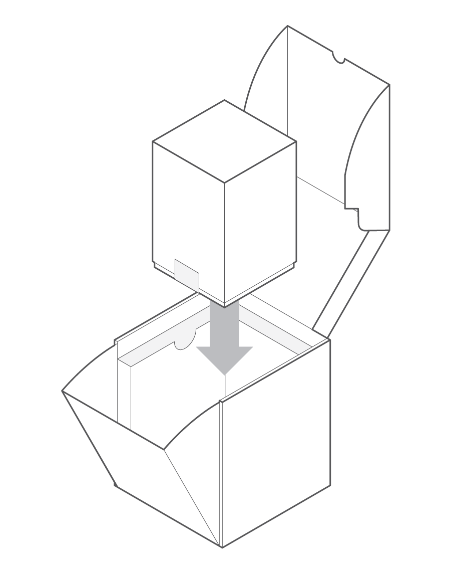 - Open the brown shipping box and carefully pull down on the front flap to reveal the insert. Place the white box into the insert.