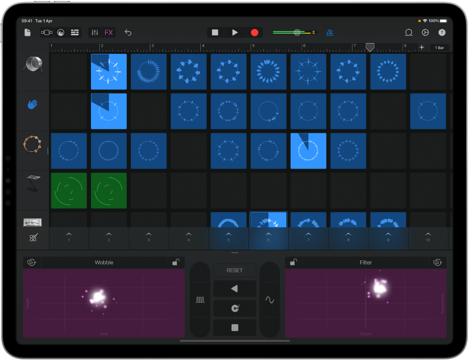 Use Live Loops to create electronic music by simply tapping cells and columns in the grid to trigger musical loops. You can build your own arrangements then improvise and record a Live Loops performance.