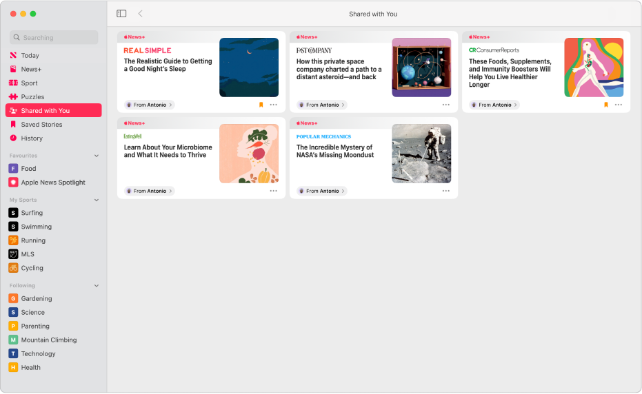 When someone shares Apple News stories with you using the Messages app, you can easily find the stories in Shared with You in the News sidebar. (News must be selected in Shared with You settings in Messages, and the person sharing the story must be in your Contacts app.)
