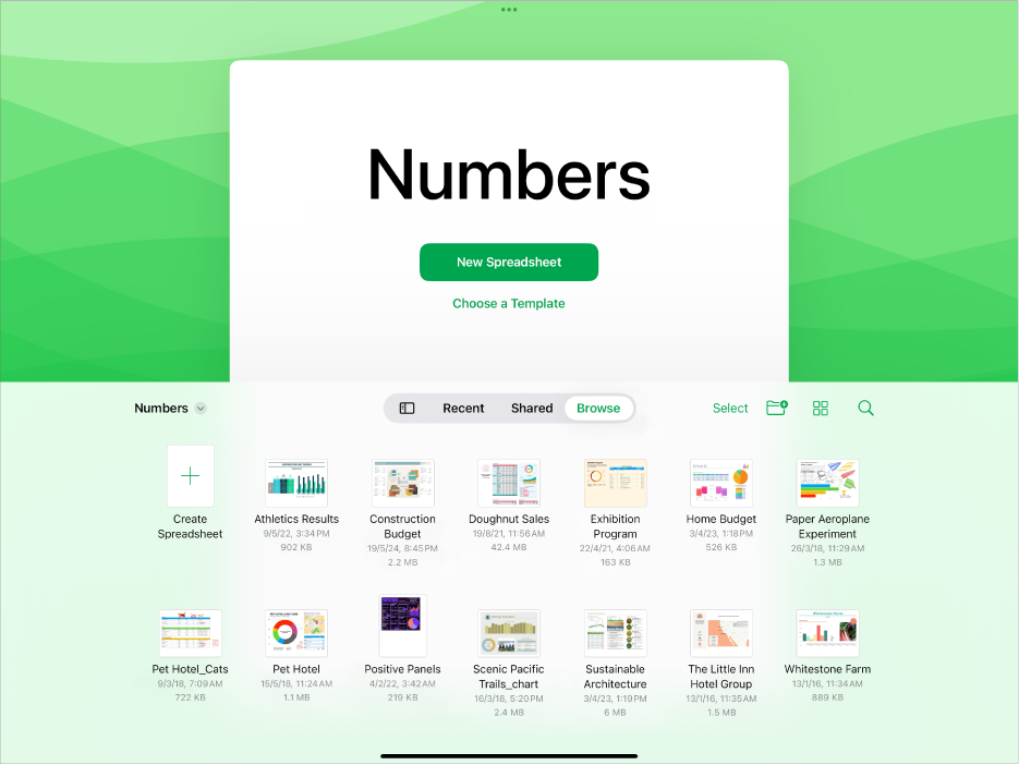 Manage your spreadsheets. Get started quickly and stay organised with the updated document manager. Jump straight into new spreadsheets and templates, or browse recent, shared and saved spreadsheets. To see the new document manager, open Numbers on your iPad.