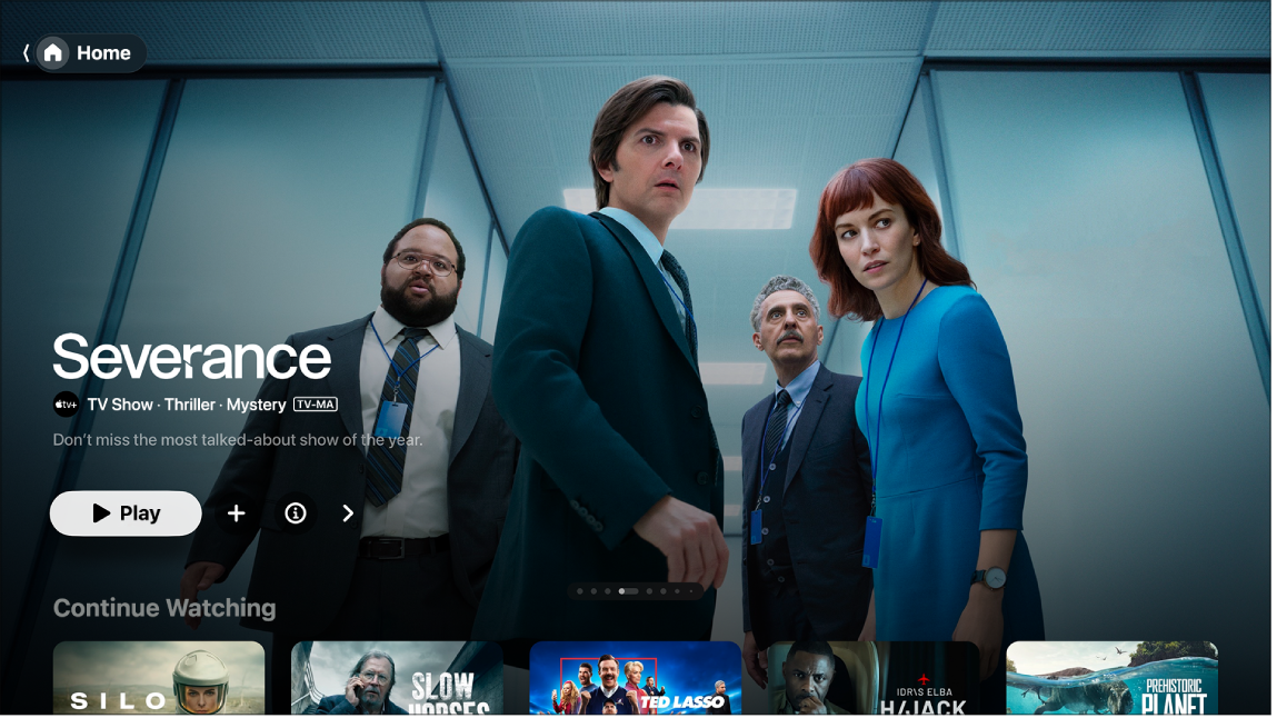 The Home screen in the Apple TV app is the place to start watching your favourite TV shows, movies and sporting events. Pick up where you left off, browse recommendations and collections, or just start watching.