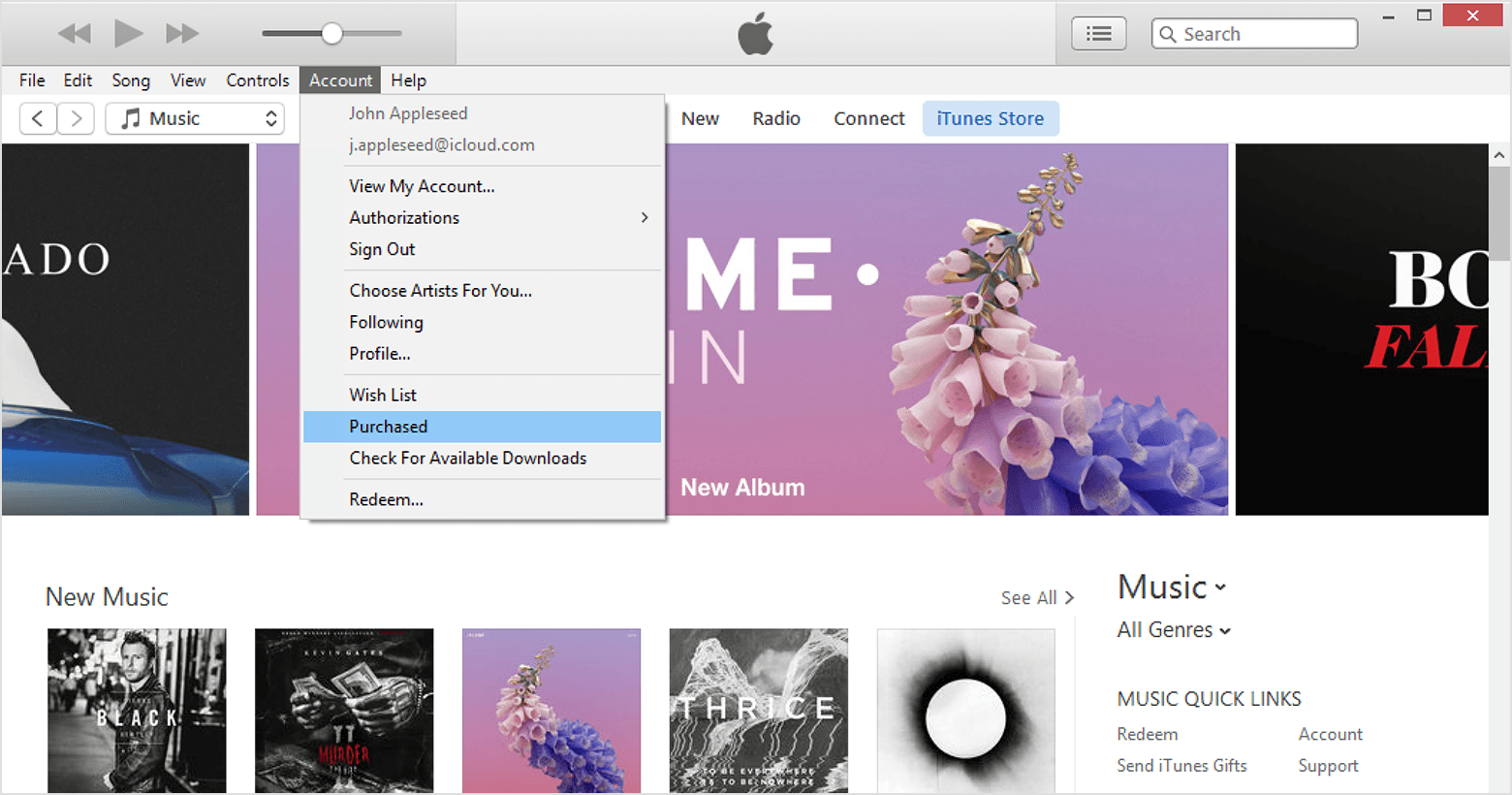 - From the menu bar at the top of the iTunes window, choose Account > Purchased. If you're a member of a Family Sharing group, you might see Family Purchases instead of Purchased.