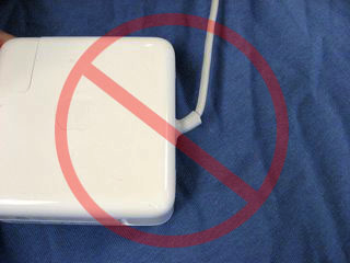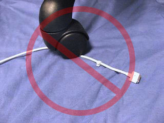 Excessive bends in the cable may ruin the cable over time. The most likely points where excessive bending may occur are near the adapter brick (Figure 3), or the MagSafe connector itself (Figure 4 and Figure 5). Ensuring slack in the cable at these particular points (Figure 6) preserves the durability of the adapter. Aim for gentle curves instead of angles. Proper usage increase its longevity.