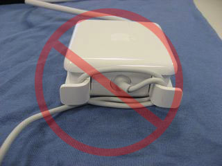 While the MagSafe power adapter is designed to travel with your Mac notebook, certain usage patterns can contribute to the fraying or breaking of cables. The MagSafe adapter, like any other metal wire or cable, is subject to becoming weak or brittle if repeatedly bent in the same spot. Follow the recommendations below to reduce the likelihood of damaging the adapter.