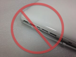 Mac notebooks have the MagSafe connector on the left side of the computer. With the T-style adapter, if you need the cable for the adapter run to the right side of the computer, run the cable around the back (Figure 9) instead of under the computer (Figure 10). When using the L-style adapter, never run the cable along the ports with the connector plugged in backwards as this will make it very difficult to disconnect. Make sure there is plenty of slack on the connector side and that the connection is not strained (Figure 14).