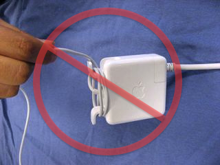 Properly disconnecting the MagSafe connector from the computer can prolong the life of the adapter. Using the connector itself instead of the cord is discussed further in Mac notebooks: How to disconnect the MagSafe power adapter.