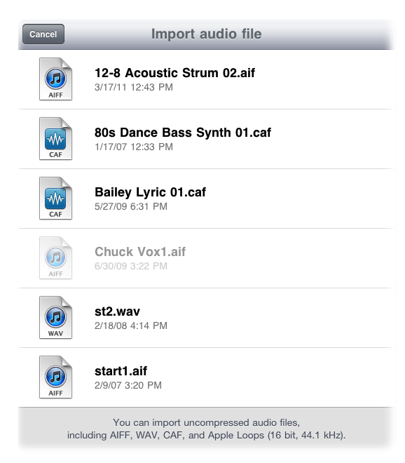 You can import an audio file from your computer into Tracks view. GarageBand for iOS supports uncompressed audio files with a 44.1 kHz sample rate and 16-bit depth (the standard for audio CDs). You can also import Apple Loops. If the audio file is an unsupported sample rate or bit depth it will be unavailable in the import window.