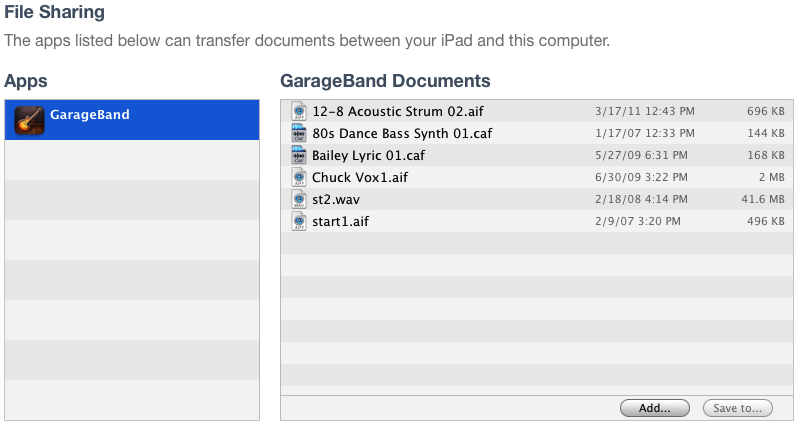 - On your computer, add the audio files you want to import to the GarageBand File Sharing area in iTunes.