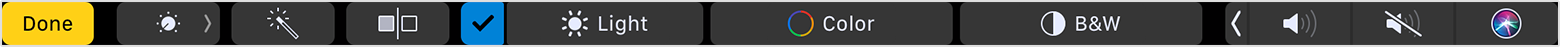 Edit your photos: When you open a photo in Edit view, you can use Touch Bar controls to apply light, color, or black-and-white adjustments. Tap