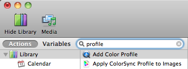 - In Automator's Name search field type in "profile" to find the Automator actions of "Add Color Profile" (videos) and "Apply ColorSync Profile to Images" (images).