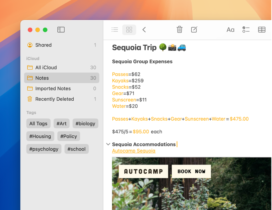 Calculate answers to basic arithmetic and complex expressions, and even work with variables — right from Notes. As soon as you type an equals sign, Notes solves expressions inline.