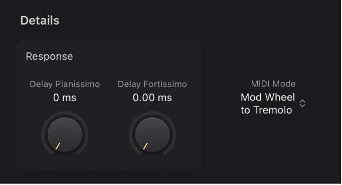 Con los parámetros de detalle de Vintage Electric Piano puedes definir una respuesta de retardo a velocidades de MIDI entrantes y establecer cómo debe manejar el instrumento los controladores MIDI.