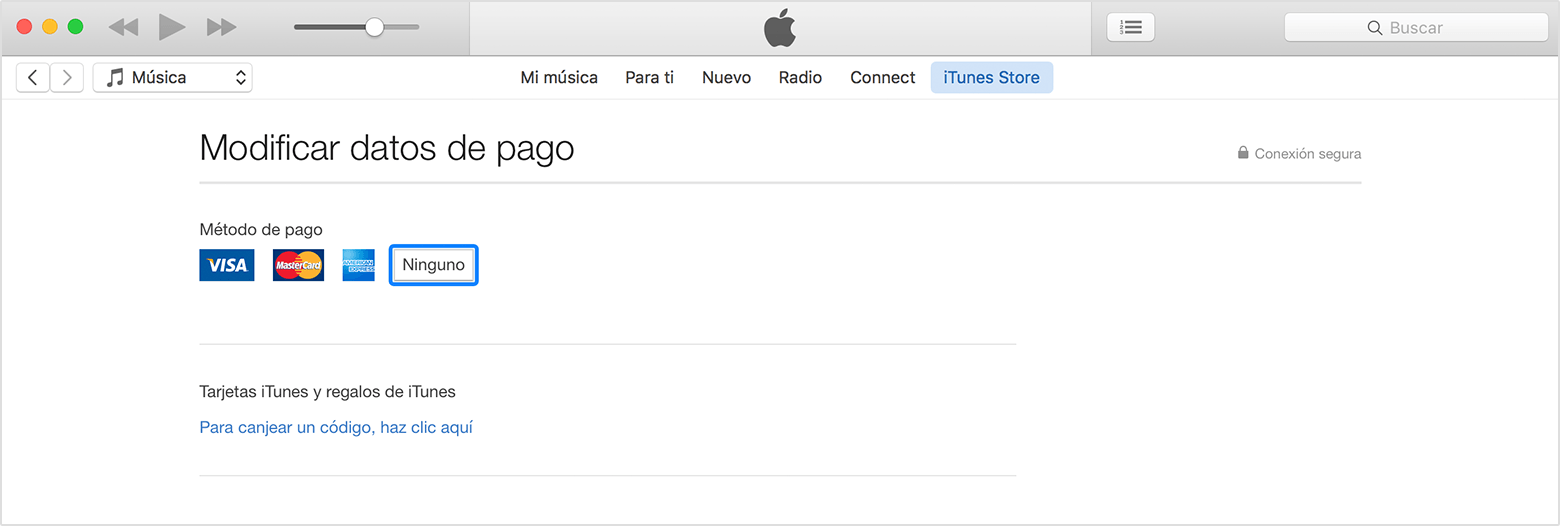 Si no dispones de una cuenta de iTunes, podrás ver estas opciones de pago aceptadas cuando crees una nueva cuenta. Necesitarás añadir una forma de pago la primera vez que la utilices para iniciar sesión en el iTunes Store, el App Store o el iBooks Store. También puedes eliminar la forma de pago después de iniciar sesión en la tienda. No se te volverá a pedir una forma de pago hasta que hagas la primera compra.