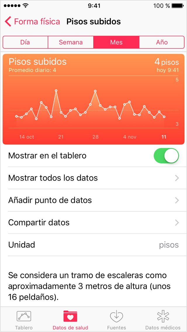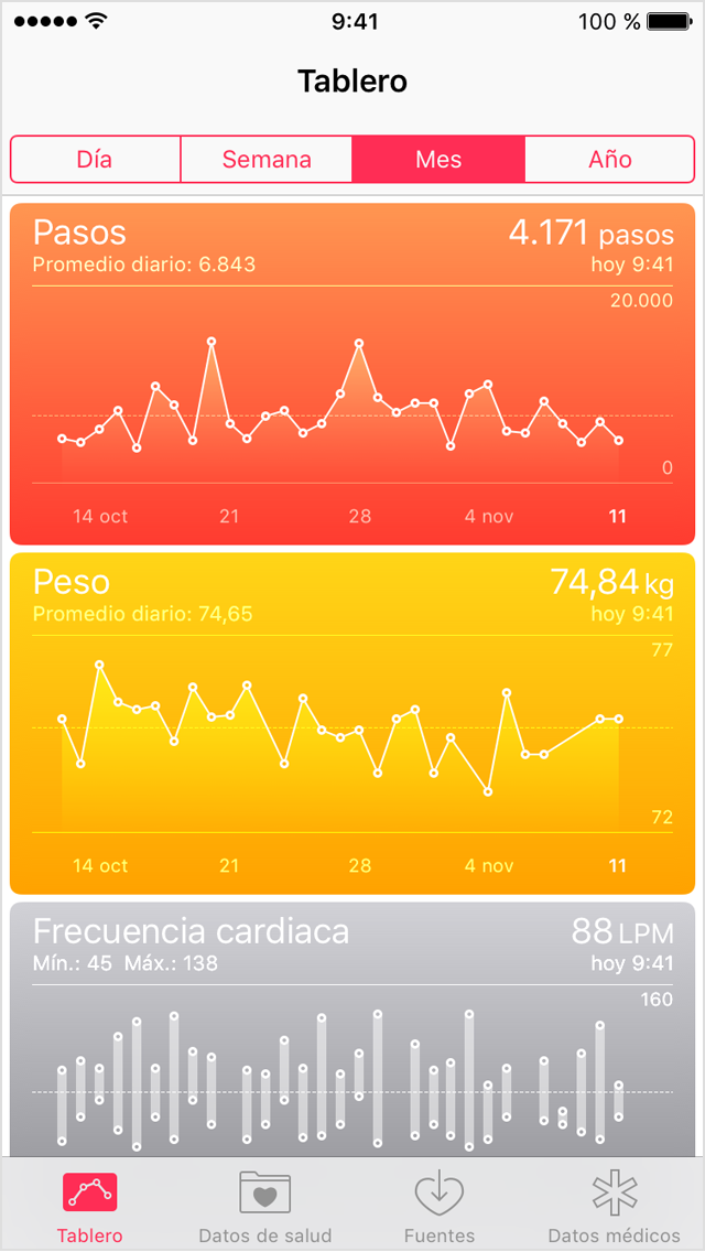 Salud cuenta automáticamente tus pasos y la distancia cuando paseas y corres. Y, si tienes un Apple Watch, este hará un seguimiento automático de los datos de Actividad. También puedes introducir datos en una categoría de Salud o bien obtener datos de cualquiera de tus apps favoritas o de los dispositivos compatibles con Salud.