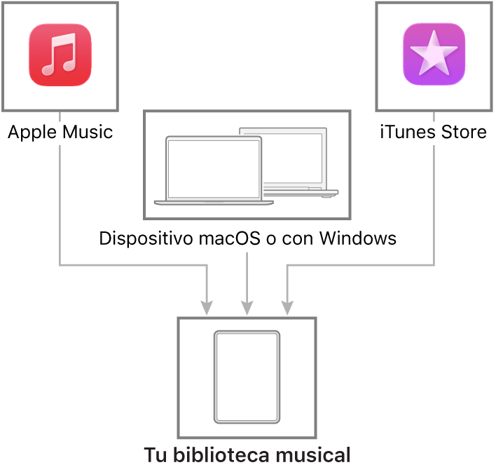 Conecta el Mac o el dispositivo con Windows para transferir y actualizar la música entre el iPad y tu dispositivo. Para sincronizar el contenido compatible, usa la app Música (macOS 10.15 o versiones posteriores) o iTunes (macOS 10.14 o versiones anteriores y dispositivos con Windows).