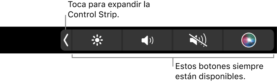Para obtener más información sobre el Control Strip, consulta Conceptos básicos del MacBook Pro. Para obtener más información sobre la Touch Bar, consulta el Manual de uso de macOS Cómo usar la Touch Bar de tu Mac.