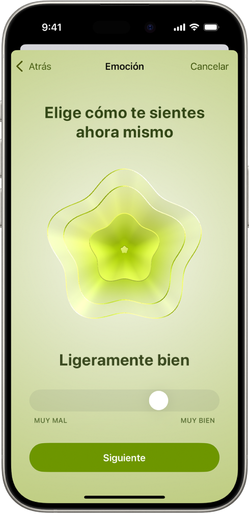 Arrastra el regulador para indicar cómo te sientes, y toca Siguiente.