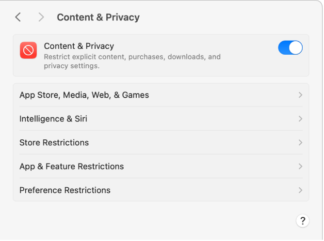 Configurar restricciones de contenido y privacidad en Tiempo en pantalla en la Mac