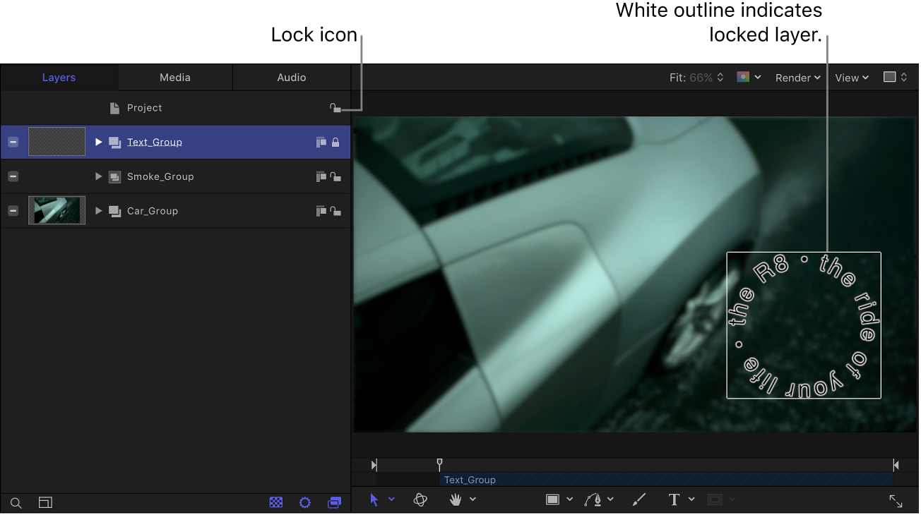 Nota: No es posible bloquear objetos que contengan parámetros publicados (para utilizarlos en Final Cut Pro). Dichos objetos muestran un control de bloqueo atenuado. Para obtener más información sobre la forma de publicar parámetros, consulta Adición de controles a plantillas.