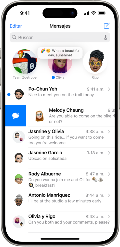 Apple Intelligence* puede mostrarte un resumen de los mensajes no leídos en una conversación. Consulta Usar Apple Intelligence en Mensajes