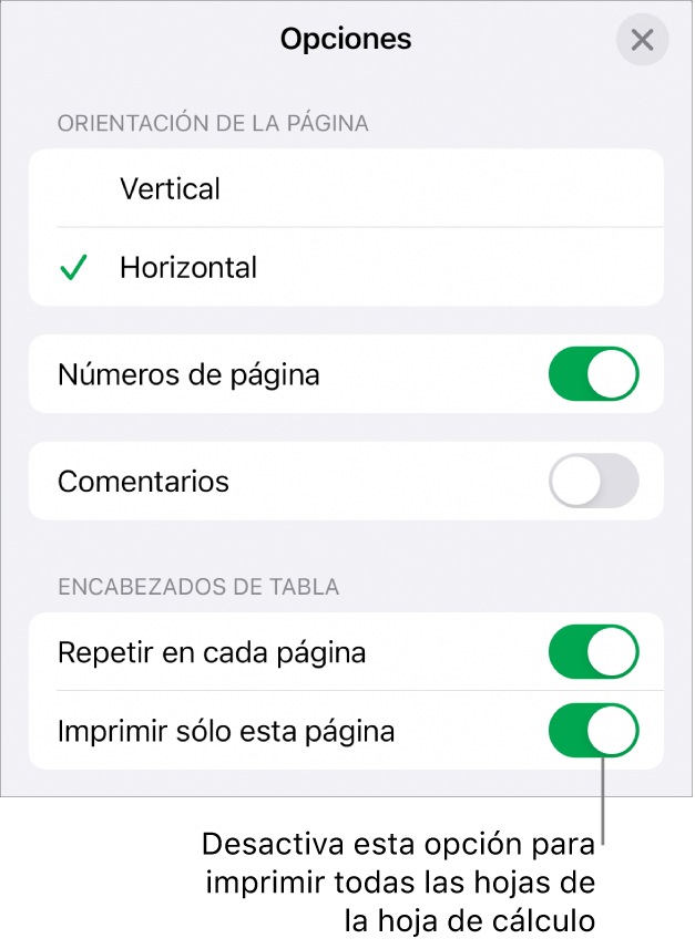 Si está activada la opción Imprimir sólo esta página, sólo se imprimirá la hoja seleccionada. Para imprimir toda la hoja de cálculo, toca para desactivar Imprimir sólo esta página.