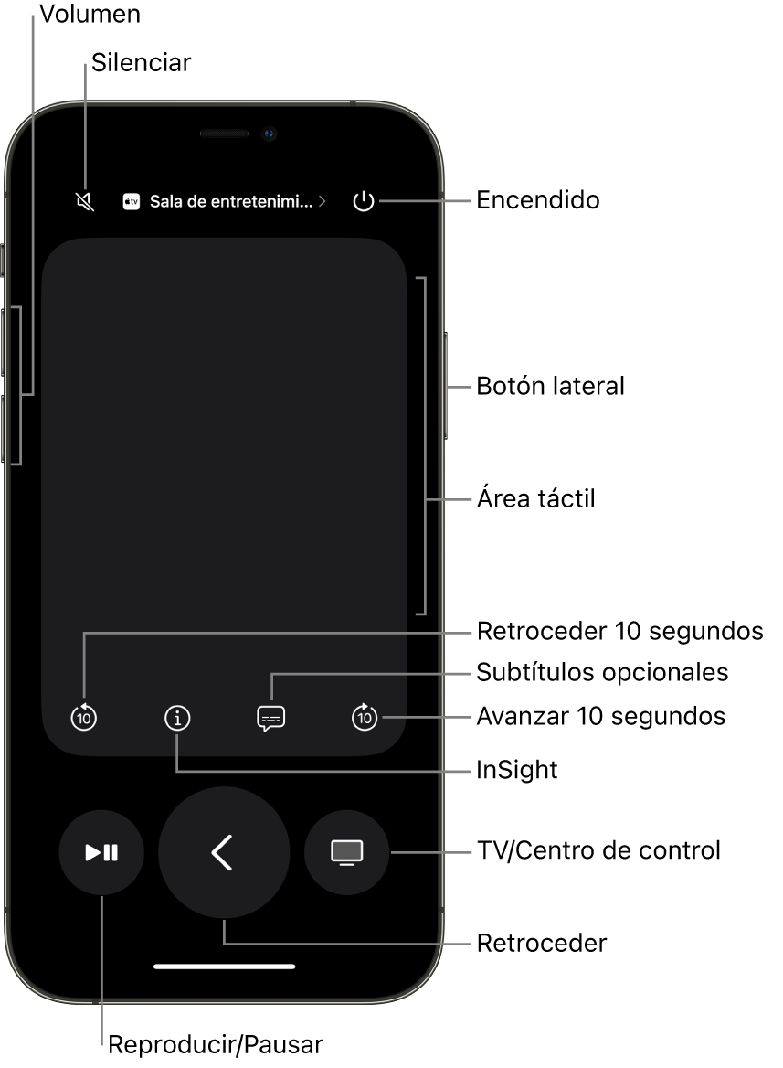 para acceder a InSight y demás información directamente en tu iPhone o iPad sin interrumpir la experiencia de visualización en la TV. Para obtener más información, consulta Obtener información sobre programas, personajes, actores y música.Acceder a la guía de TV en apps de TV en vivo compatibles.