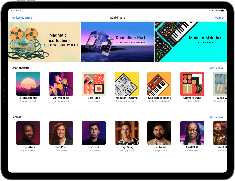 Äänikirjastossa voit ladata ja hallita äänipaketteja, jotka sisältävät sadoittain looppeja, ääniä, kosketusinstrumentteja, rumpusettejä ynnä muuta. GarageBand antaa ilmoituksia, kun uusia äänipaketteja on tarjolla ladattaviksi.