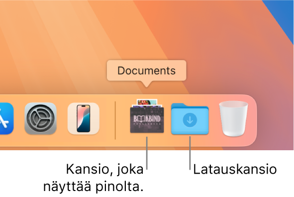 Macin Dockissa on oletusarvoisesti Lataukset-kansio tiedostoille, jotka lataat internetistä, vastaanotat liitteinä tai hyväksyt AirDropia käyttämällä. Se voi näkyä Dockissa sinisenä kansiona, jossa on lataussymboli, tai pinona tiedostoja. Voit lisätä muita kansioita Dockiin, jotta ne ovat helposti käsillä.