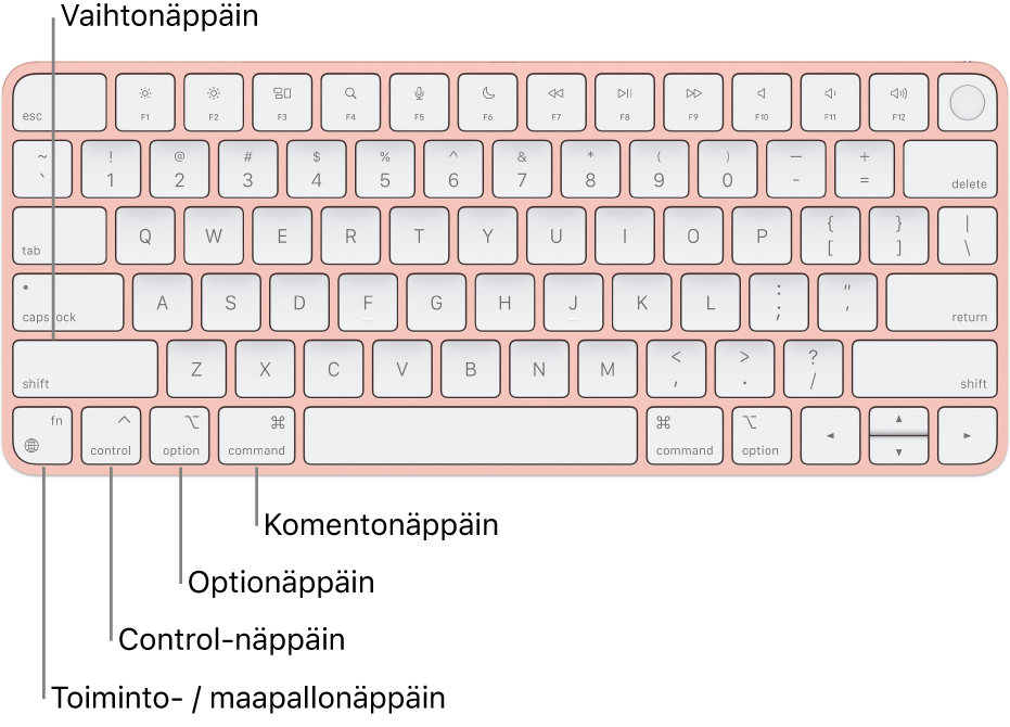 Huomaa: Jos sinulla on Touch‑ID:llä ja numeronäppäimistöllä varustettu Applen Magic‑Keyboard, fn/maapallonäppäin sijaitsee poistonäppäimen oikealla puolella.