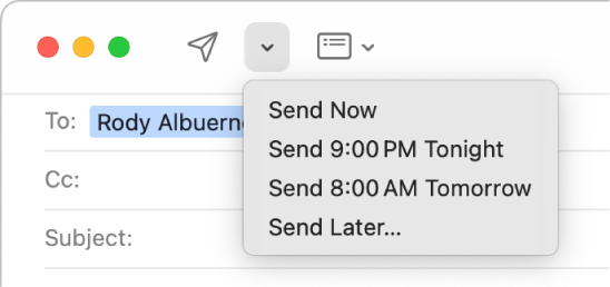 ja valitse aika tai aseta päivämäärä ja aika valitsemalla Lähetä myöhemmin.Sähköposti näkyy Lähetä myöhemmin -postilaatikossa Mailin sivupalkissa.
