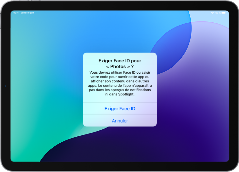 Écran verrouillé. La position de l’heure s’adapte de façon dynamique en fonction de la photo ou du fond d’écran de l’écran verrouillé, et le sujet demeure toujours visible. Lorsque vous déplacez votre iPad, la photo de votre écran verrouillé prend vie grâce à un nouvel effet 3D. Consultez la rubrique Créer un écran verrouillé d’iPad personnalisé.